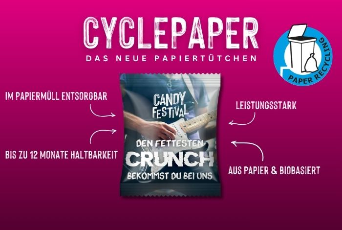 CyclePaper ist ein innovatives Verpackungsmaterial auf Papierbasis. Es besteht überwiegend aus biobasierten, nachwachsenden Rohstoffen und ist damit eine umweltfreundliche Alternative zu herkömmlichen Werbetütchen aus Kunststoff. Trotz seiner Papierbasis überzeugt CyclePaper durch eine hohe Schutzwirkung und ist damit bestens für den Einsatz bei Werbesüßigkeiten geeignet.