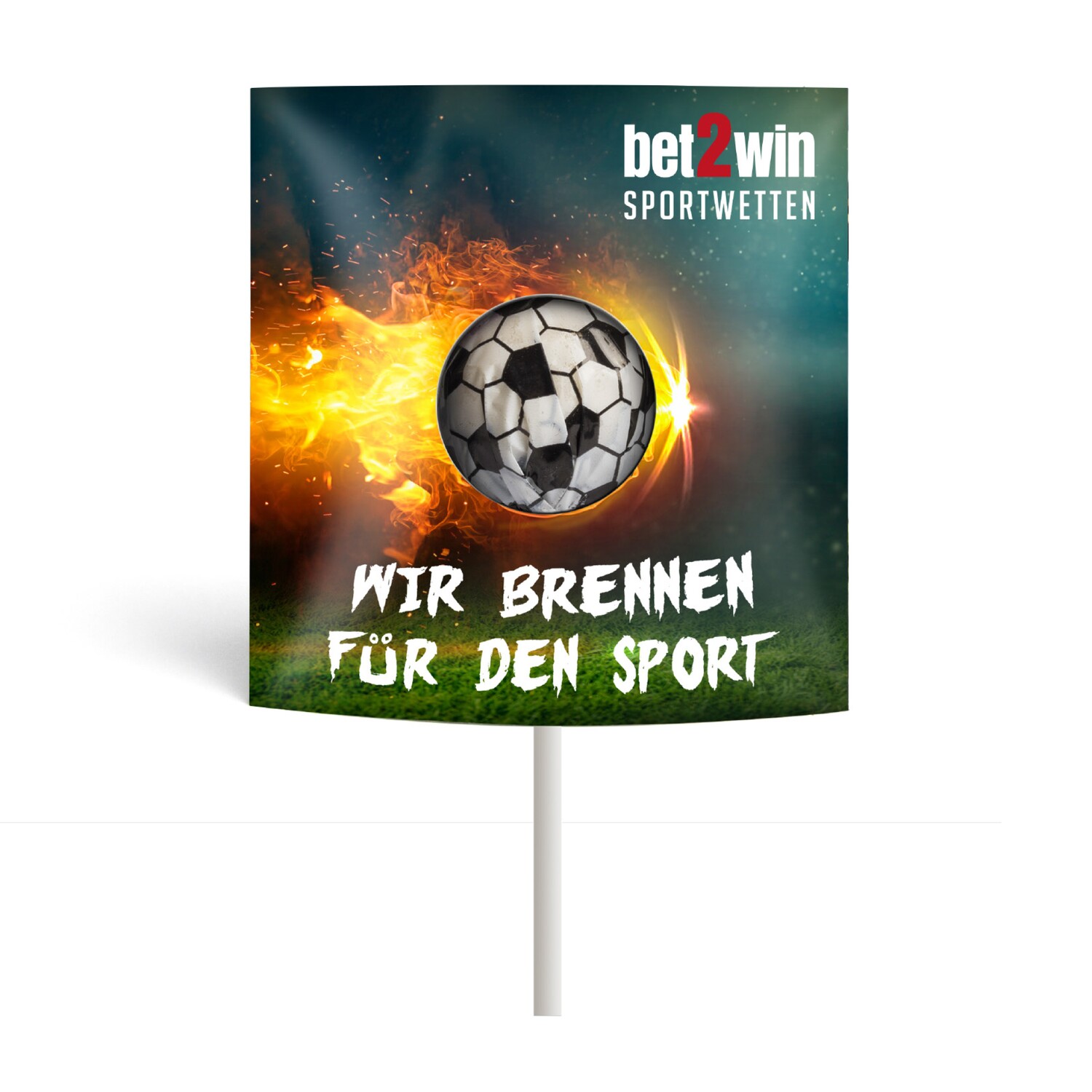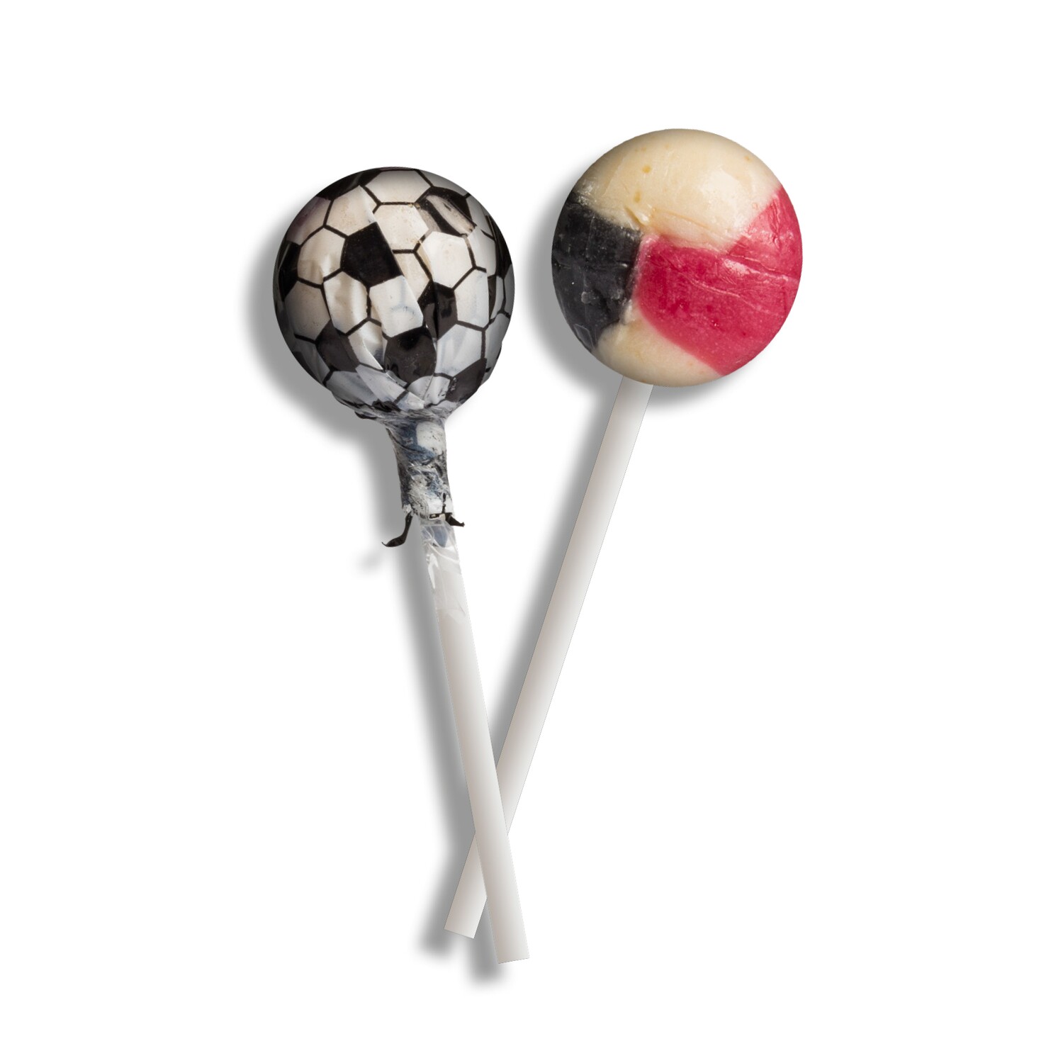 Standard Kugellolly in Deutschlandfarben verpackt in Folie mit Fußballdesign und in individuell bedruckter Klemmkartonage in Quadratform. Variante: 18 g | 4c Euroskala