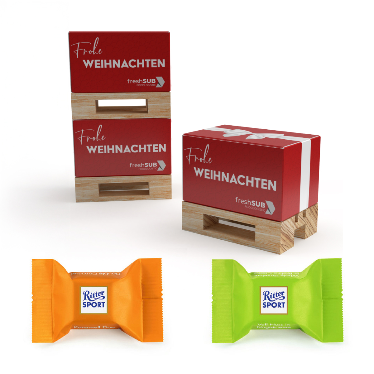 Diese Geschenkbox auf einer Mini-Palette lässt besonders die Herzen aus der Transport-Branche höher schlagen. Die Box kann vollflächig veredelt und mit zahlreichen Füllmöglichkeiten ausgestattet werden. Second Life: Nach Gebrauch kann die Box mit kleinen Büroartikeln wie Heftklammern befüllt und weitergenutzt werden. Variante: 16 g | Ritter Sport: Karamel Duo & Voll-Nuss | 4c Euroskala