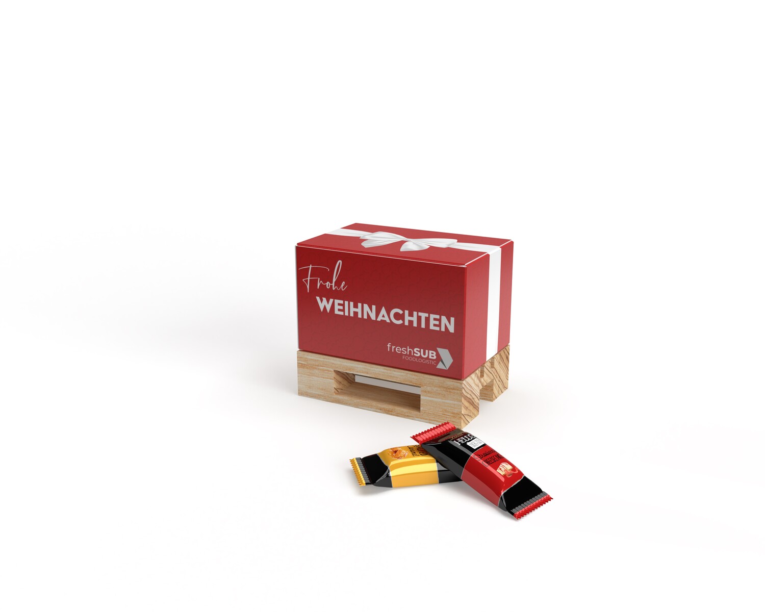 This gift box on a mini pallet is sure to delight hearts in the transportation industry. The box can be fully customized and equipped with various fillings. Second Life: the box can then be re-used by filling it with small office supplies such as paper clips and staples. Variant: 20 g | HELLO Mini Sticks (Salted Caramel, Strawberry Cheesecake) | CMYK