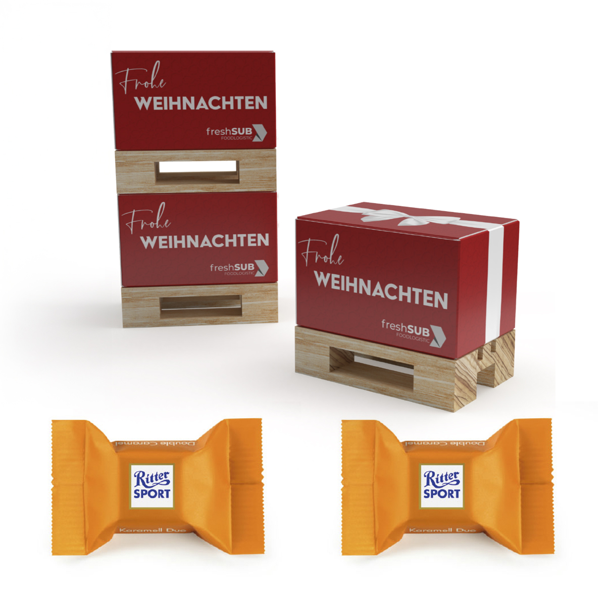 This gift box on a mini pallet is sure to delight hearts in the transportation industry. The box can be fully customized and equipped with various fillings. Second Life: the box can then be re-used by filling it with small office supplies such as paper clips and staples. Variant: 16 g | Ritter Sport: Caramel Duo | CMYK